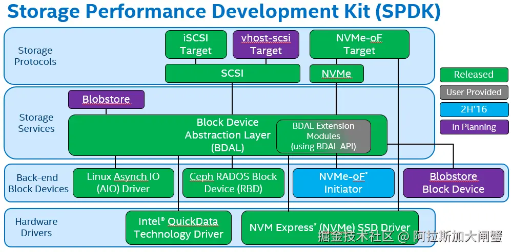 为了帮助存储OEM(设备代工厂)和ISV(独立软件开发商)整合硬件,Intel构造了一系列驱动,以及一个完善的、端对端的参考存储体系结构,被命名为Storage Performance Development Kit(SPDK)。SPDK的目标是通过同时使用Intel的网络技术,处理技术和存储技术来提高突出显著的效率和性能。通过运行为硬件设计的软件,SPDK已经证明很容易达到每秒钟数百万次I/O读取,通过使用许多处理器核心和许多NVMe驱动去存储,而不需要额外卸载硬件。Intel在BSD license许可协议下通过Github分发提供其全部的Linux参考架构的源代码。博客、邮件列表和额外文档可以在spdk.io中找到。