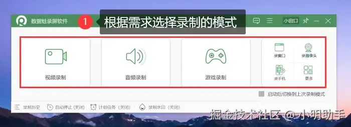 步骤1: 在数据 蛙官网上下载此软件,进行安装后打开软件进入主界面,根据录制需求选择合适的录制模式。直播录屏建议选择【视频录制】模式。