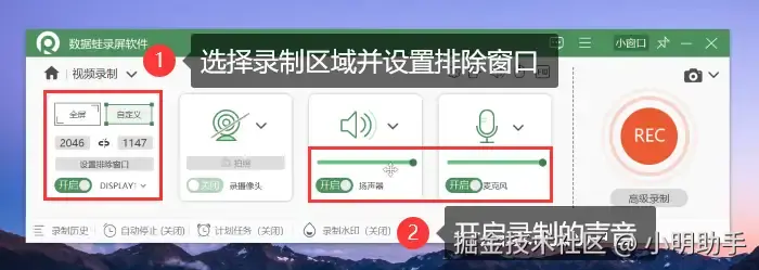 步骤2: 在【视频录制】模式中,根据直播内容选择录制的区域范围,并可设置排除窗口。可以同时开启扬声器和麦克风的声音进行录制。怎么录别人的直播视频?此时点击【REC】录制按钮录屏即可。