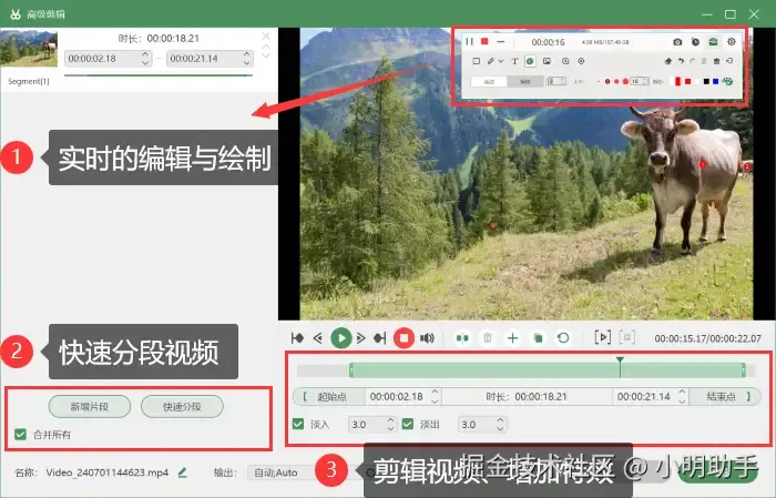 步骤3: 录制过程中我们可以使用软件自带的工具箱进行实时的编辑与绘制。录制完成后,我,我们还能进入【高级剪辑】中对视频进行分段、剪辑、增加特效等操作。