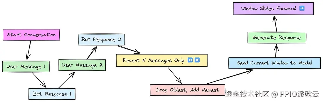 为了避免上下文过大的问题,滑动窗口应运而生。滑动窗口不需要记住所有以前的消息,而只需要记住一定数量的最近消息的上下文。