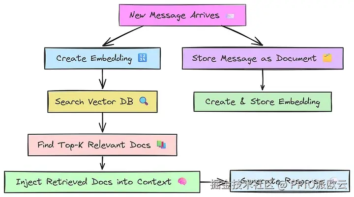 系统检索语义最相关的前 k 个文档(例如,过去最相似的 3 个对话回合)。