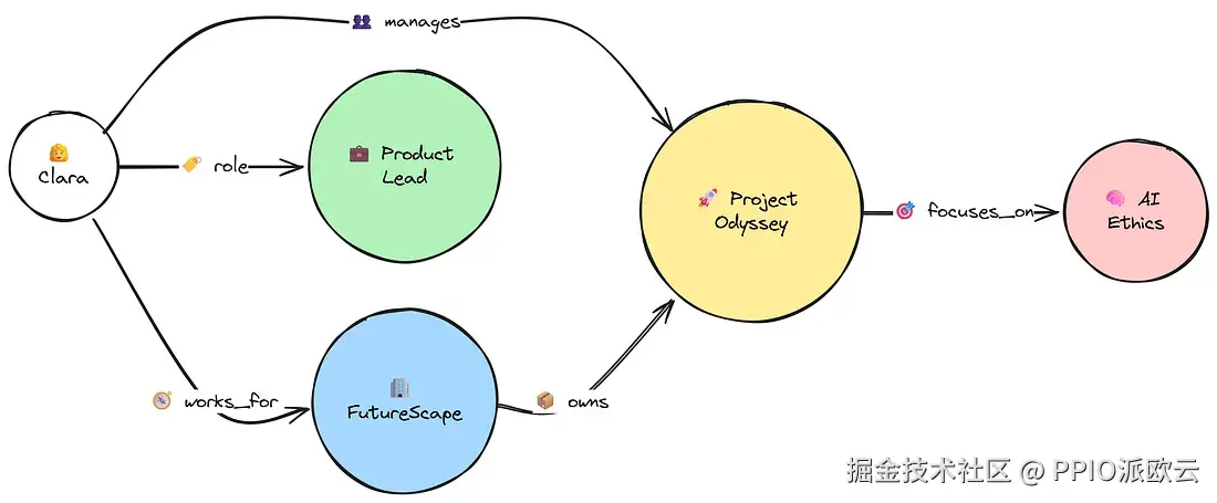 最终得到的是一种结构化的、网状的记忆形式。智能体不再简单地记录“Clara 就职于 FutureScape”这条事实,而是把这一关联存成一条连接:(Clara) --[works_for]--> (FutureScape)。