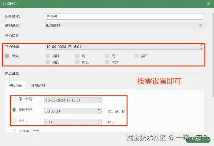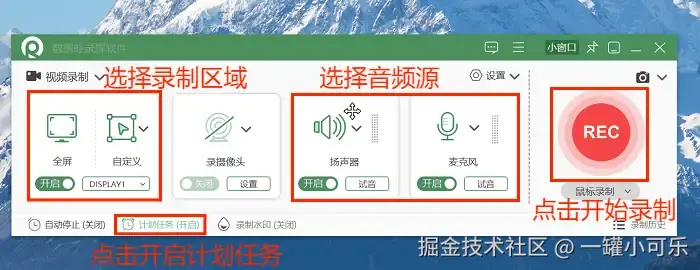 步骤2:自由选择录制的区域、选择合适的音频源,还可以开启计划录制任务哦。设置完毕点击 “REC” 就可以开始录制了。