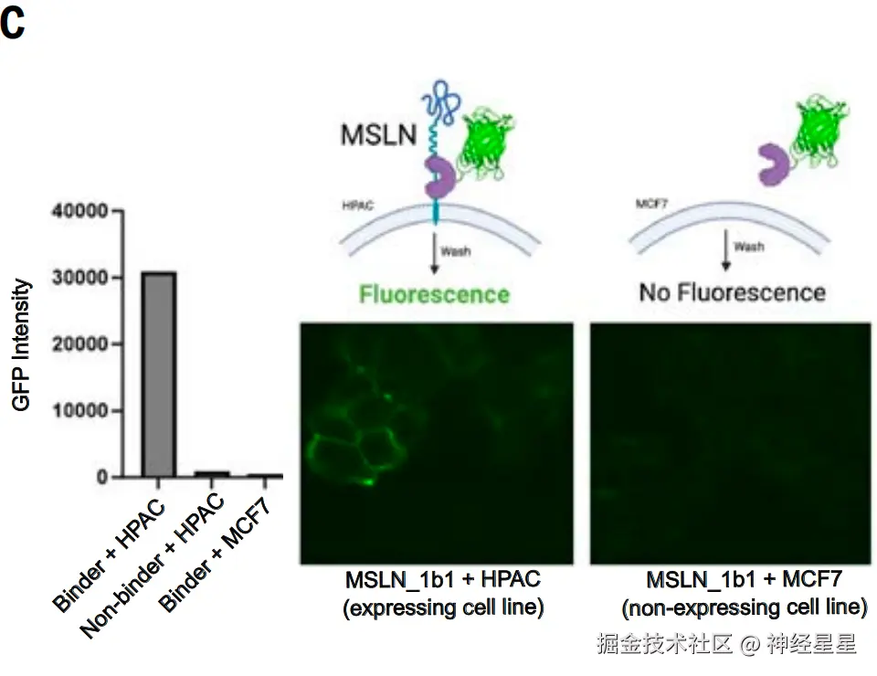 研究人员将绿色荧光蛋白(GFP)与 MSLN_1b1 融合,并与表达 MSLN 的细胞(人胰腺腺癌细胞系 HPAC)以及不表达 MSLN 的细胞系(密歇根癌症基金会乳腺癌细胞系 MCF7)共同孵育,同时设有一个不结合 MSLN 的 GFP-融合蛋白作为对照。
