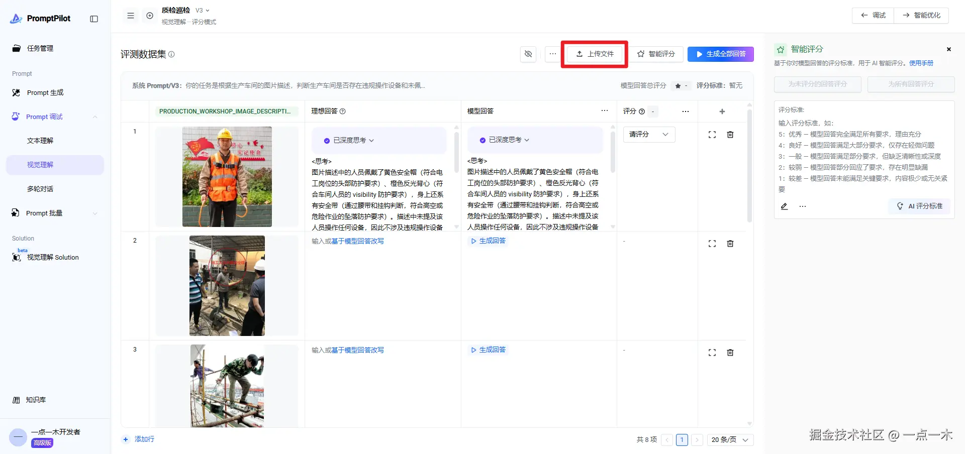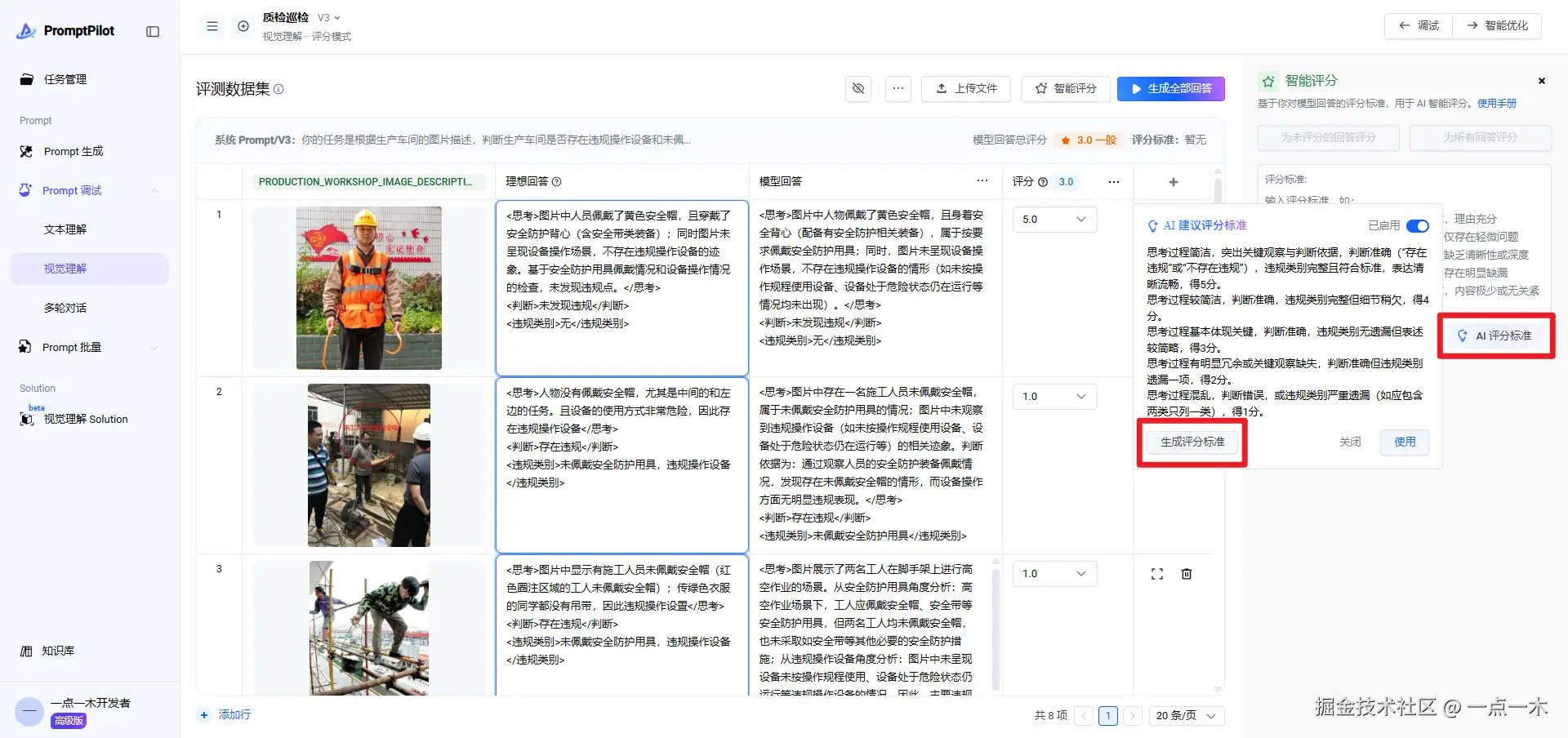 我上传了一个 XLSX 数据集,包含多张车间图片的描述(变量名与提示词中的 {{PRODUCTION_WORKSHOP_IMAGE_DESCRIPTION}} 保持一致)。PromptPilot 自动批量生成回答,并允许我为每个样本添加理想回答。得益于 Seed1.6-embedding 的多模态嵌入能力,图片描述与违规标准的匹配精准,生成报告的准确率达 95%。