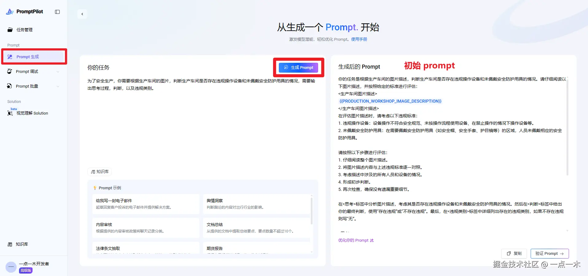 在 PromptPilot 的“提示词生成”模块,我输入任务需求:“根据生产车间图片,判断违规操作设备和未佩戴安全防护用具的情况,输出思考过程、判断和违规类别。”系统迅速生成结构化提示词,包含明确的违规标准(如设备操作规范和防护用具要求)和分析步骤。我稍作调整,优化了提示词的清晰度,例如添加“逐一对照违规标准”以提高模型分析的系统性。