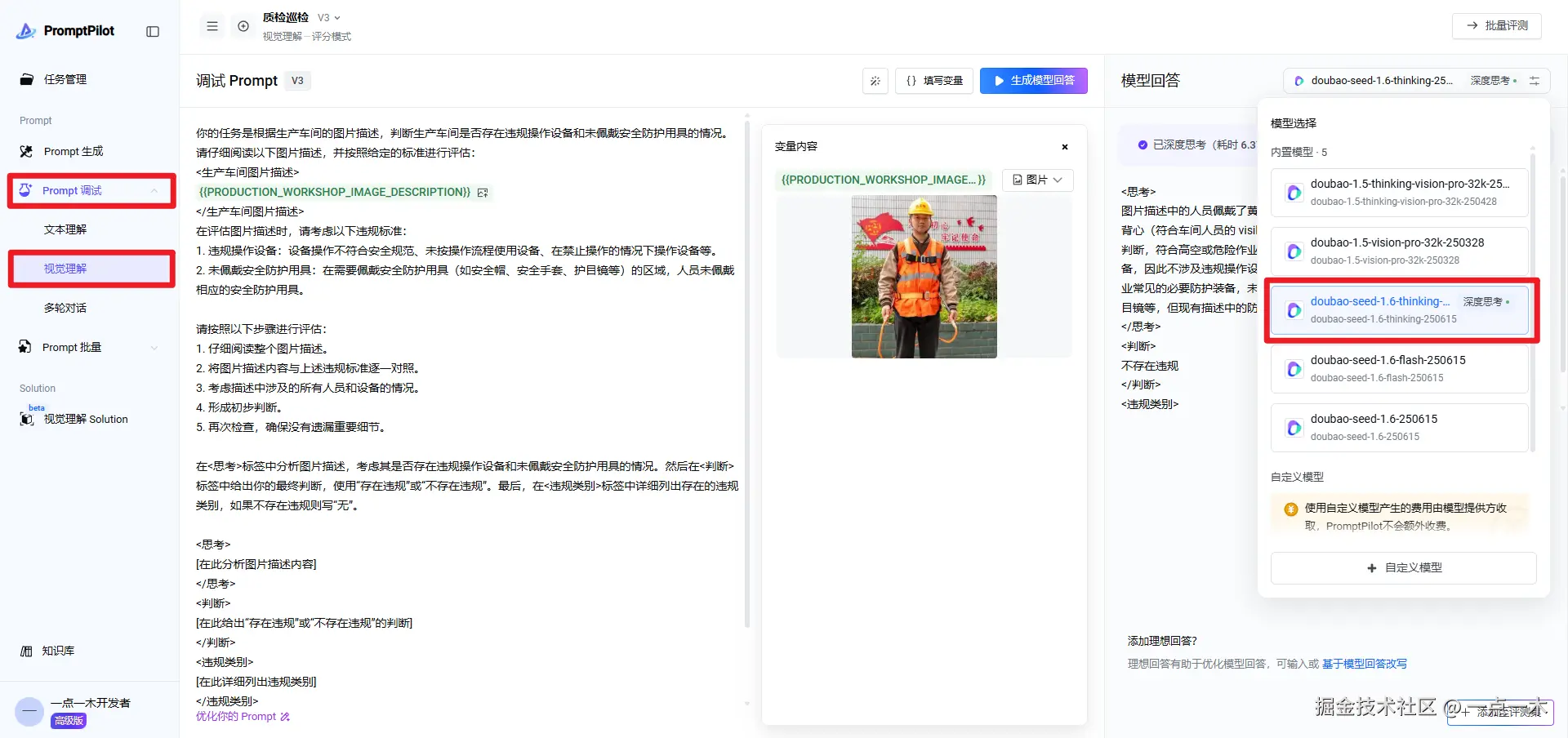 为了帮助读者更直观地理解 PromptPilot 和豆包新模型的实际应用,我以 工业质检巡检场景为例,详细展示操作流程,聚焦于图片理解能力和豆包模型的协同表现。任务目标是根据生产车间图片,判断是否存在违规操作设备或未佩戴安全防护用具的情况,并输出思考过程、判断和违规类别。
