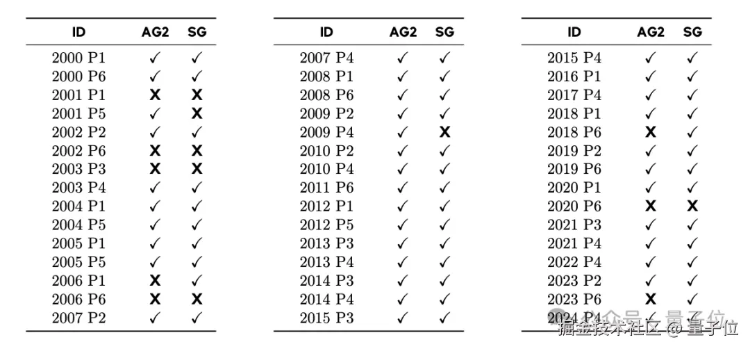 根据 IMO-AG-50 的统计方法,在 2000 年至 2024 年 IMO 几何问题中,Seed-Geometry (SG) 解决了 43 道题,比 AlphaGeometry 2 (AG2) 多解决 1 道。
