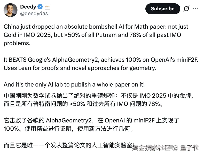 对此,前谷歌成员 Deedy Das 惊叹道:字节真不愧是唯一一家专为 IMO 发表完整论文的 AI 实验室!