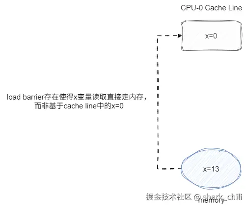 对于Load Barrier而言,若在指令前插入Load Barrier,该屏障可读取数据时强制要求处理器将本地cache line设置为无效,直接从内存中读取数据: