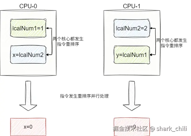 极端情况,假设两个CPU都发生编译器重排序就可能出现CPU-0先执行x=lcalNum2,CPU-1执行y=lcalNum1,因为这两个本地变量初始化赋值指令被重排序,导致x、y最终被设置为0: