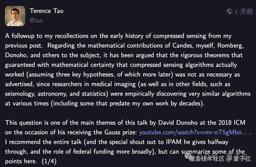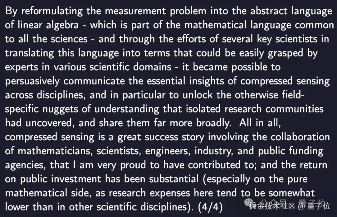 他又开新帖,洋洋洒洒,以自己曾参与推动的 “压缩感知” 研究为例,力证公共投资在数学领域的回报是怎样一点点累积出来、并最终改写现实世界的。