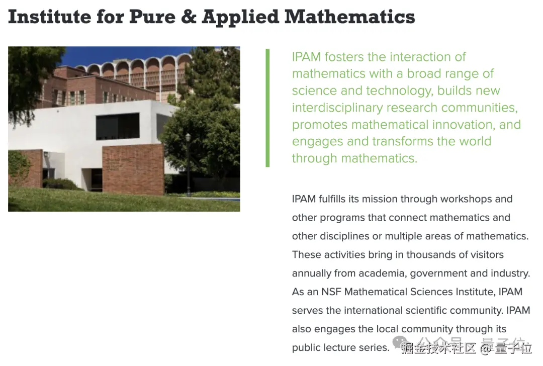 自 2000 年成立以来,IPAM 以促进数学与科学技术各领域的跨学科合作为使命,推动了数学新方法在健康、工程、材料科学、机器学习、人工智能、物理等领域的应用。