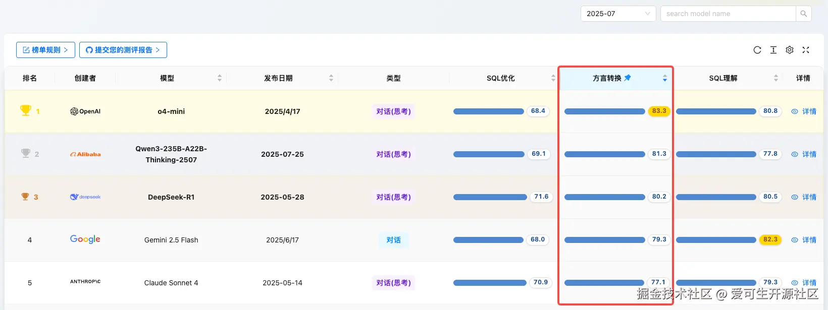 2025 年 7 月,AI 大模型在代码生成与理解领域,特别是数据库 SQL 能力上的竞争日趋白热化。