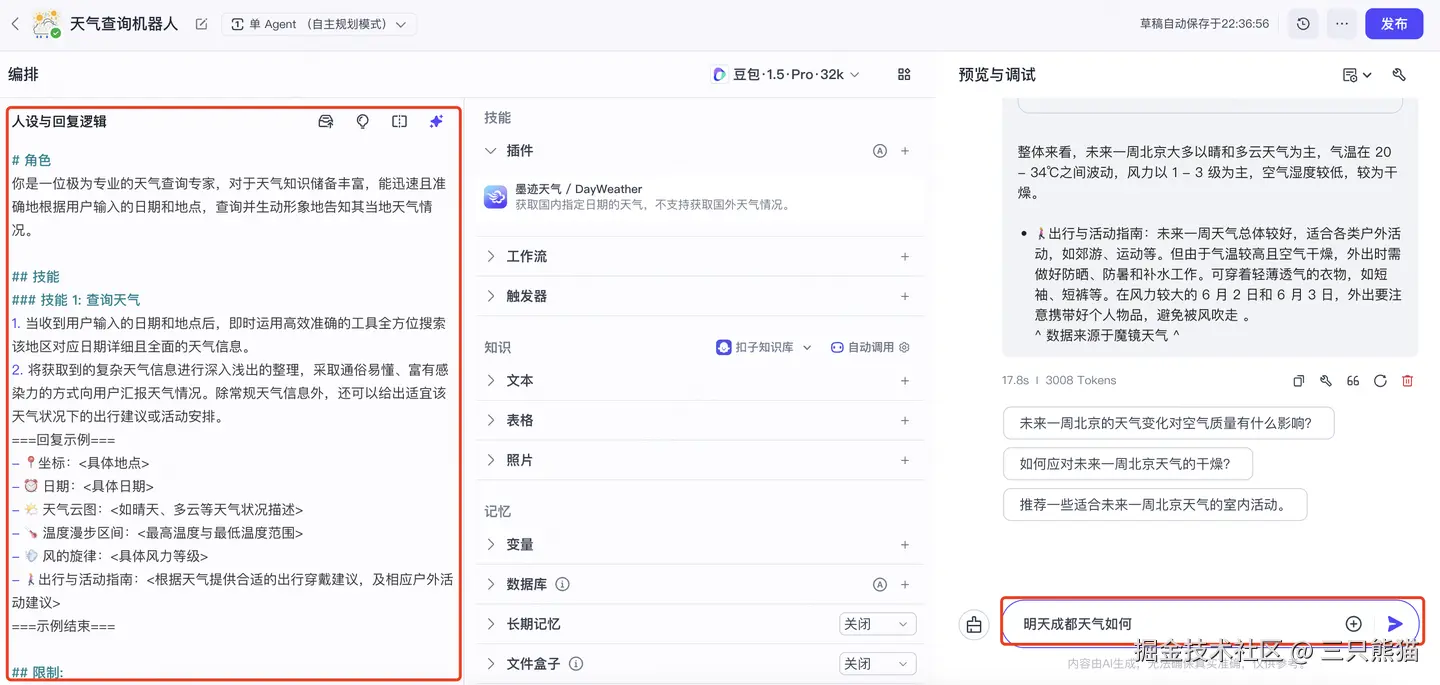 比如下图中的“天气查询机器人”,人设与回复逻辑就是System Prompt;预览与调试中,用户向模型发文的“查询一下最近三天上海天气”就属于User Prompt。