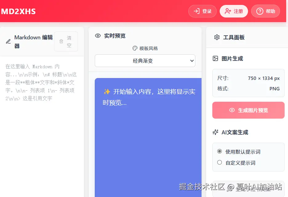 MD2XHS(Markdown to 小红书)是一个专为小红书内容创作者设计的前端工具,能够将 Markdown 格式的文本转换为精美的小红书风格图片,同时调用AI一键归纳总结出符合小红书风格的标题和文案。该项目基于 Vue 3 + TypeScript 构建,提供了直观易用的界面和强大的功能。