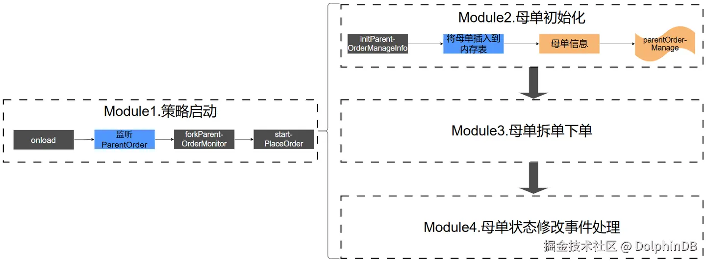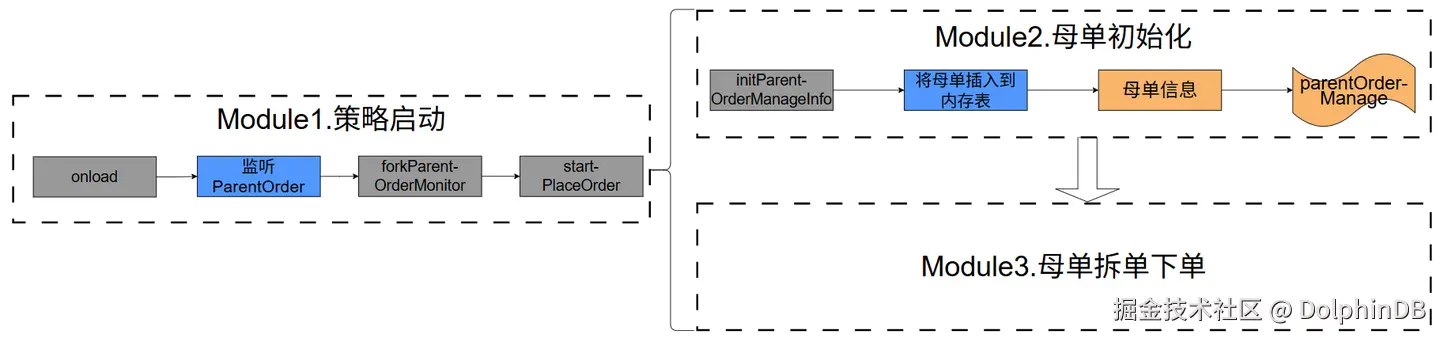 onload 方法设置了一个事件监听器,监听所有的母单事件 ParentOrder 。当监听到该类型事件时,下一步将启动整个拆单下单过程。为了控制母单拆单下单的线程安全,为每个母单创建不同的 Monitor 实例,因此在对应的回调函数 forkParentOrderMonitor 中需要包含对 Monitor 实例的创建和母单参数传递等步骤。从 onload 方法开始,函数调用的流程与实现的功能可以分为三个模块,如下图所示。