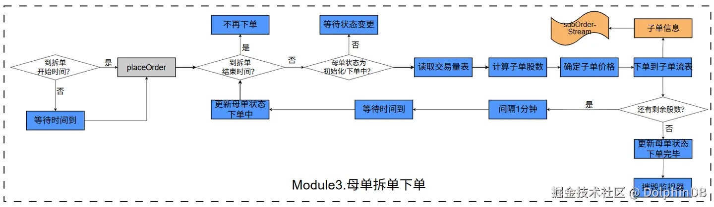 其中, startPlaceOrder 函数是两个模块的启动函数,启动顺序如上图所示。模块 3 中,函数调用的流程与实现的功能如下图所示。