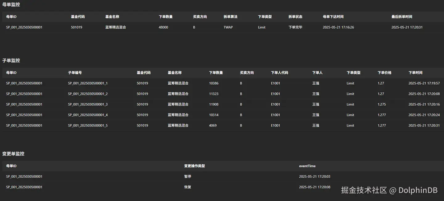 OrderAlterAction事件的监听,当OrderAlterAction注入 CEP 引擎,监视器根据母单当前状态和目标状态对母单进行操作。例如将处于下单状态的母单设置为暂停下单,此时 CEP 引擎会暂停拆单下单的过程,监听下一个OrderAlterAction事件注入引擎,从而恢复下单。OrderAlterAction事件输出到状态修改流表中。 - 可视化:Dashboard 是 DolphinDB 提供的一个强大的数据可视化和分析工具,旨在帮助用户更好地理解和利用数据。将子单流表和状态修改流表中的数据输出到 Dashboard ,可以实时观察母单的拆单下单过程,以及母单的状态修改情况。
