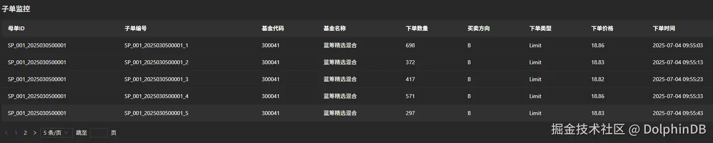 可以观察到,子单的下单数量根据当前时段的历史交易比例计算得到,下单时间间隔为 10s;子单的下单价格为 snapshotOutputKeyedTb 中基金代码为 300041 的买一价格。