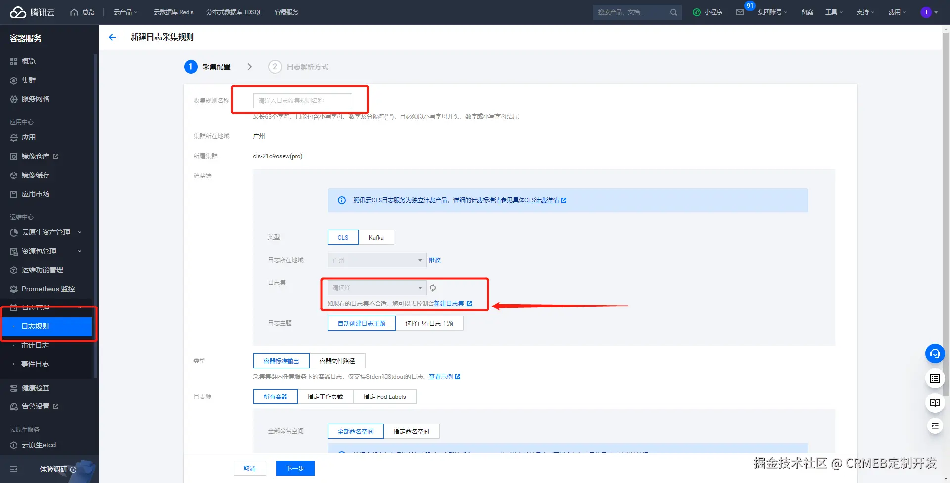 「技术干货」CRMEB电商系统集群部署 + 腾讯云日志托管最佳实践 CRMEB定制开发 2025-08-06 37 阅读1分钟 CLS日志的使用说明 开启日志采集 运维功能管理链接:console.cloud.tencent.com/tke2/ops 编辑日志规则 1. 点击创建日志规则,添加手机规则名称,点击创建日志集 2. 进入日志主题列表,进行创建 3. 工作负载选项选择Deployment创建的名称,日志采集路径完全按照如下图