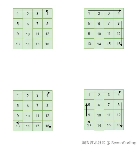 - 当遇到边界或已访问的位置时,顺时针旋转方向