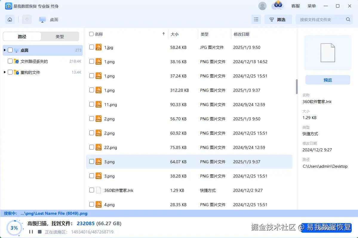 步骤2.在扫描过程中可以随时暂停或终止扫描,也可以对找到的文件进行免费预览,或执行恢复操作。扫描完成后或在发现对应文件后暂停/终止,找到并勾选文件进行恢复。如果您记得原始文件路径,可以通过路径找到数据,否则,您可以通过类型找到文件。右上角搜索文件或文件夹名称,可以帮助您快速找到所需文件。