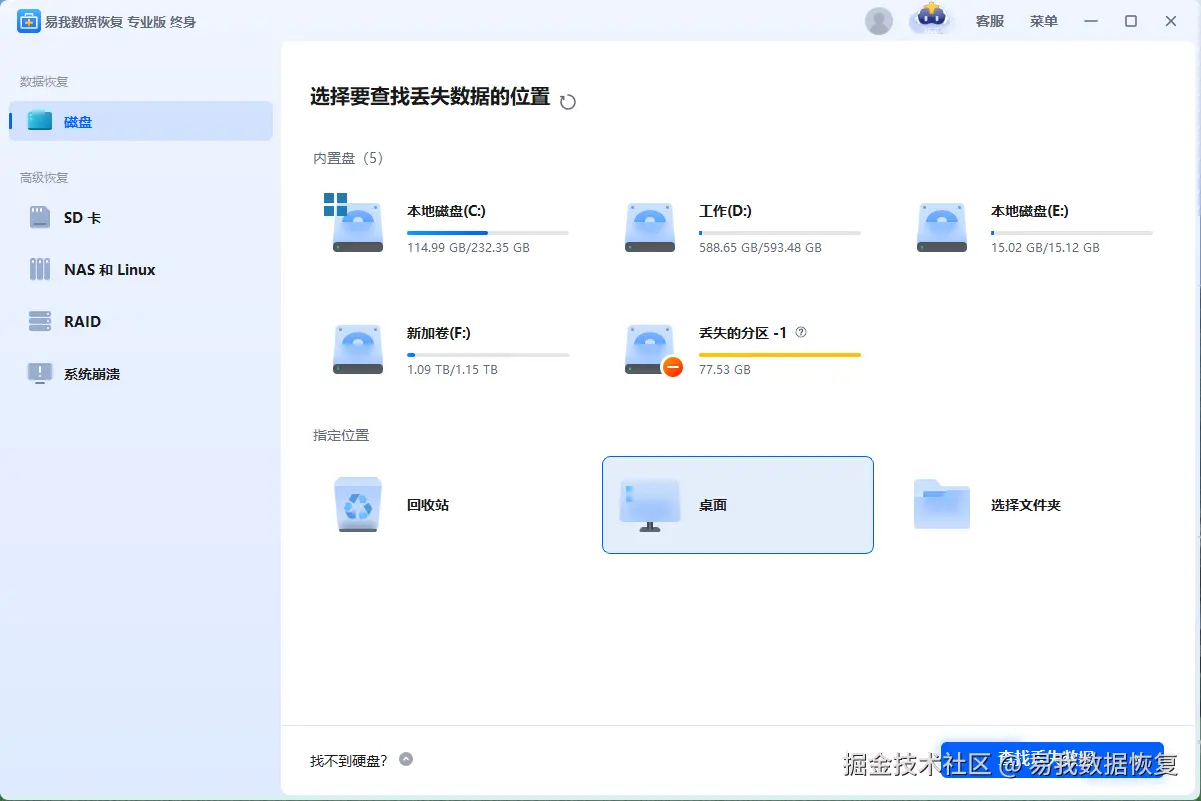 此外,我们还可以使用专业数据恢复软件——易我数据恢复来恢复桌面丢失的文件。软件支持恢复因多种原因丢失的文件数据,包括删除、格式化、分区丢失、分区raw、部分病毒感染等。对于重装C盘丢失的文件,软件有一定概率可以找回。