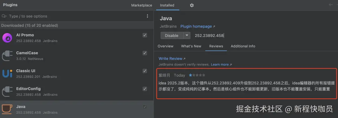 临时切回旧版可用 Java 插件,等待官方更新插件修复问题。(当然最最最好的解决方式就是等官方更新插件修复问题,故这里只是临时方案,博主不能保证会不会遇到其他问题,请知悉~)