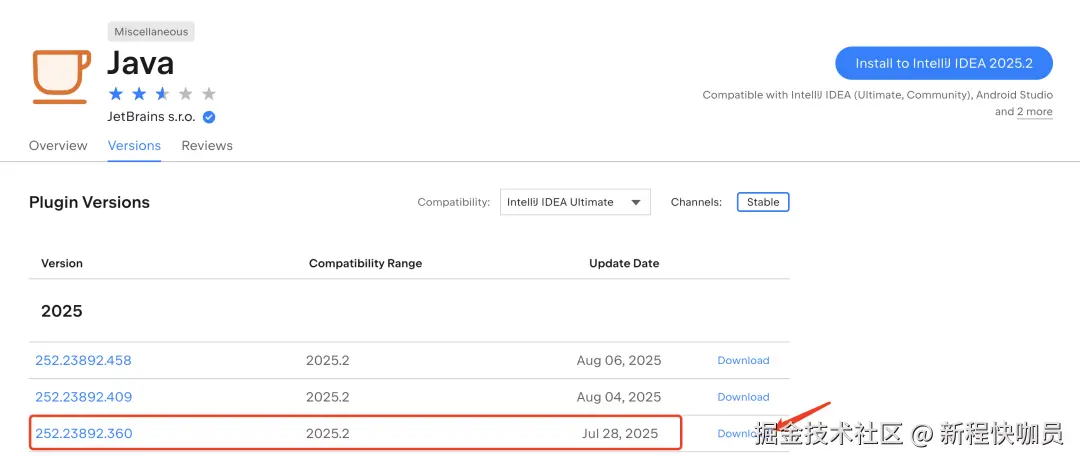 原来也有人遇到了这个问题!想想IDEA 2025.2 EAP出了那么多版,这个问题可能是近期修改某个bug或增加特性导致的,我开始访问插件主页查看历史版本,尝试切换为能用的版本... (ps: 博主开发了Maven With Me(MPVP)插件,所以对插件安装也有一定的研究 )