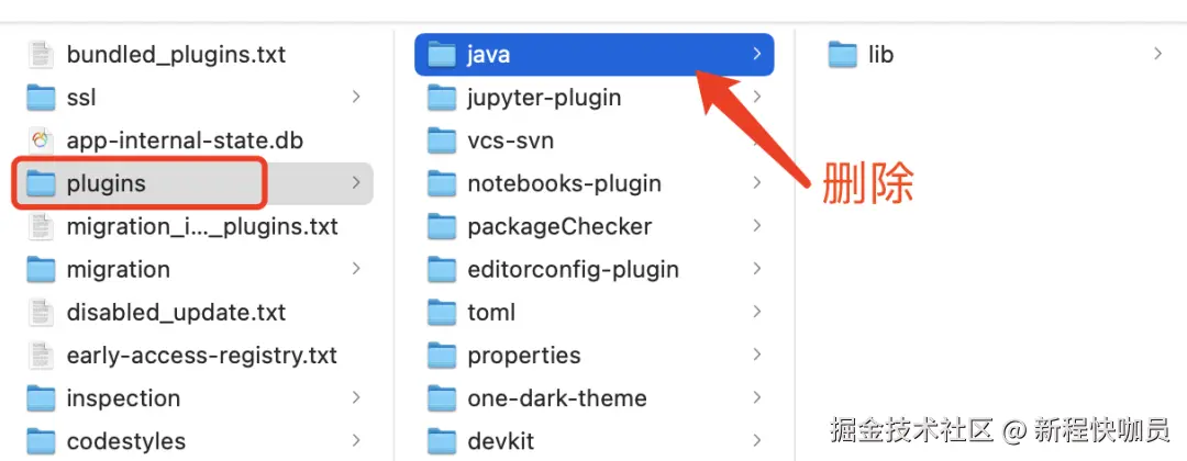 如MacOs社区版的插件目录是 ~/Library/Application\ Support/JetBrains/IdeaIC2025.2/plugins,删除 java 目录即可。(Windows社区版就是C:\Users%username%\AppData\Roaming\JetBrains\IdeaIC2025.2\plugins)
