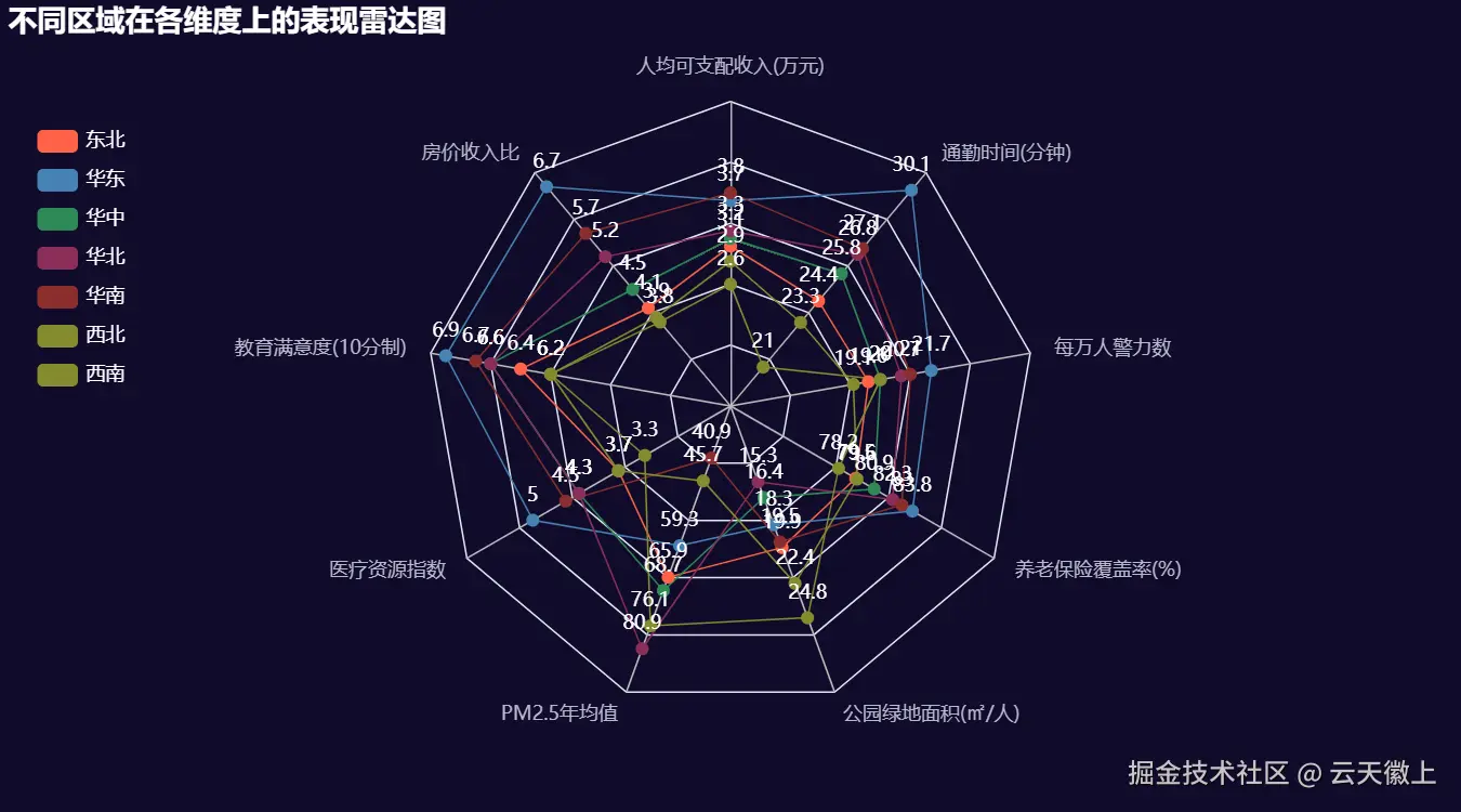 多维表现: 各区域在医疗、教育、环境等维度表现各异,雷达图清晰展示了区域发展的不平衡性。