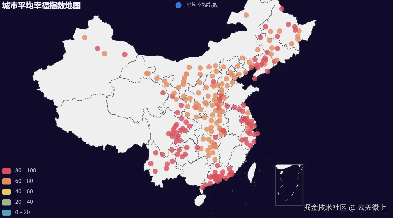 在当今社会,城市的幸福指数不仅是居民生活质量的重要体现,也是衡量城市竞争力的关键指标。本文将通过 Python 和 Pyecharts 对中国城市幸福指数及其影响因素进行深度可视化分析。我们将从多个维度出发,结合多种炫酷的图表,展示数据背后的深刻洞察,并最终生成一个可移动的可视化大屏,为数据分析和决策提供有力支持。