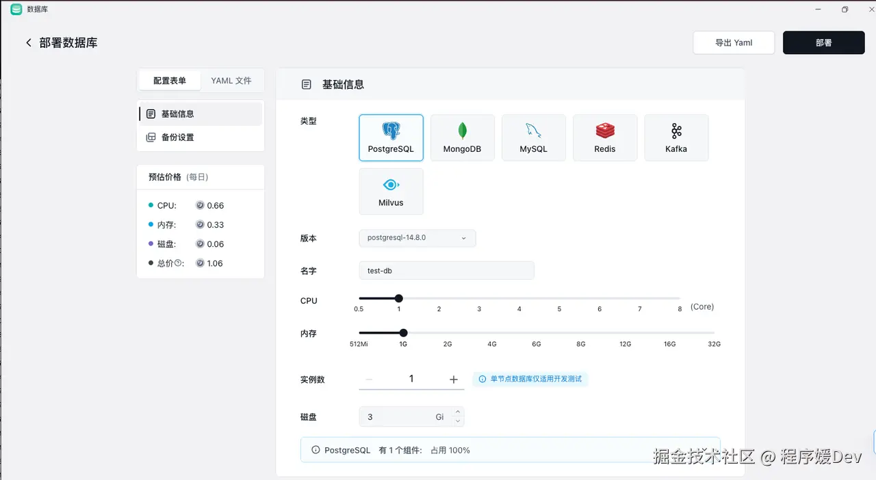 - 选择你想要的类型(MySQL, PostgreSQL, Redis...),备份设置可以自行选择