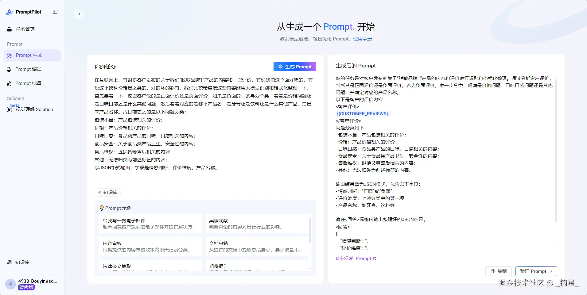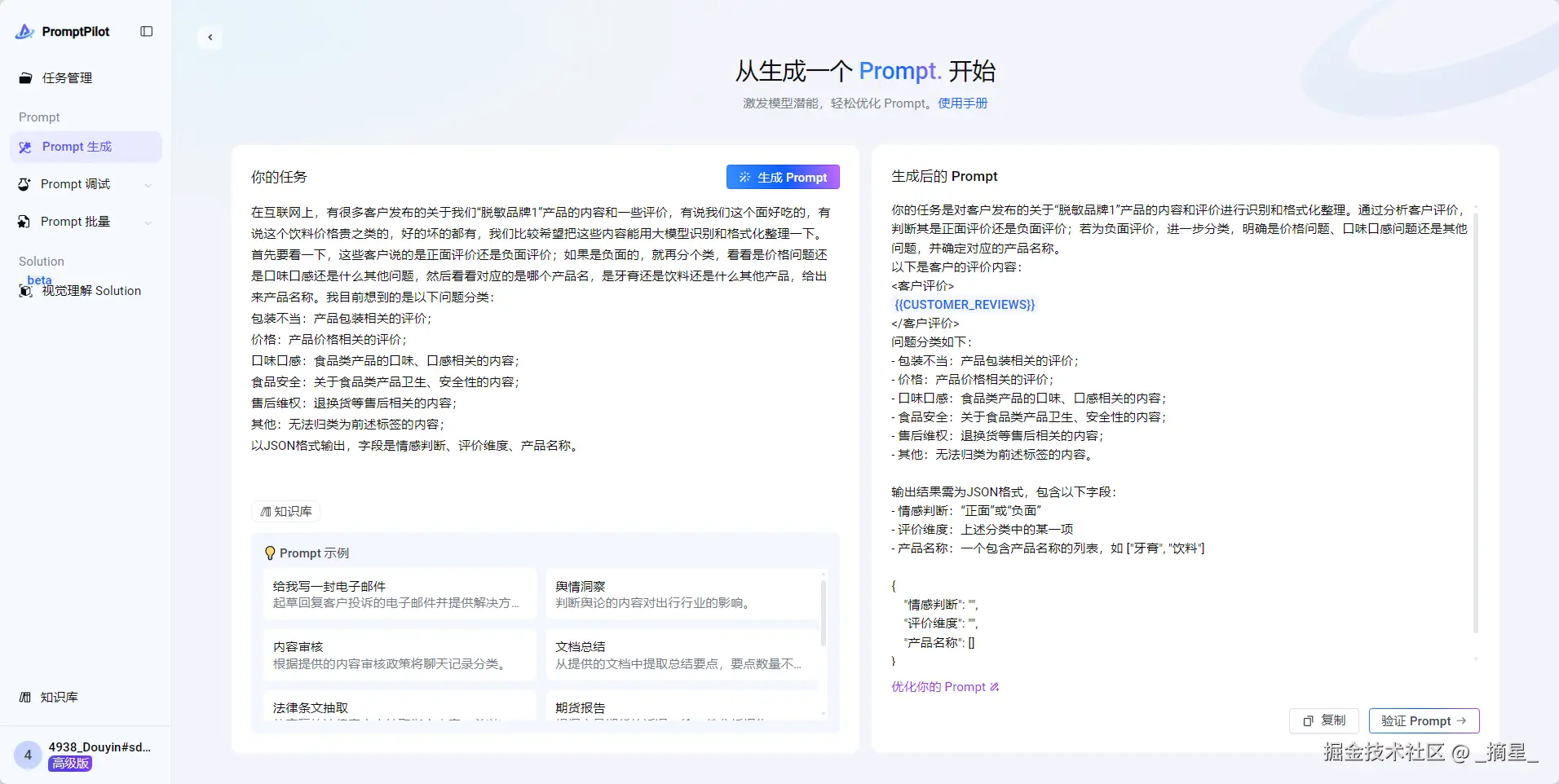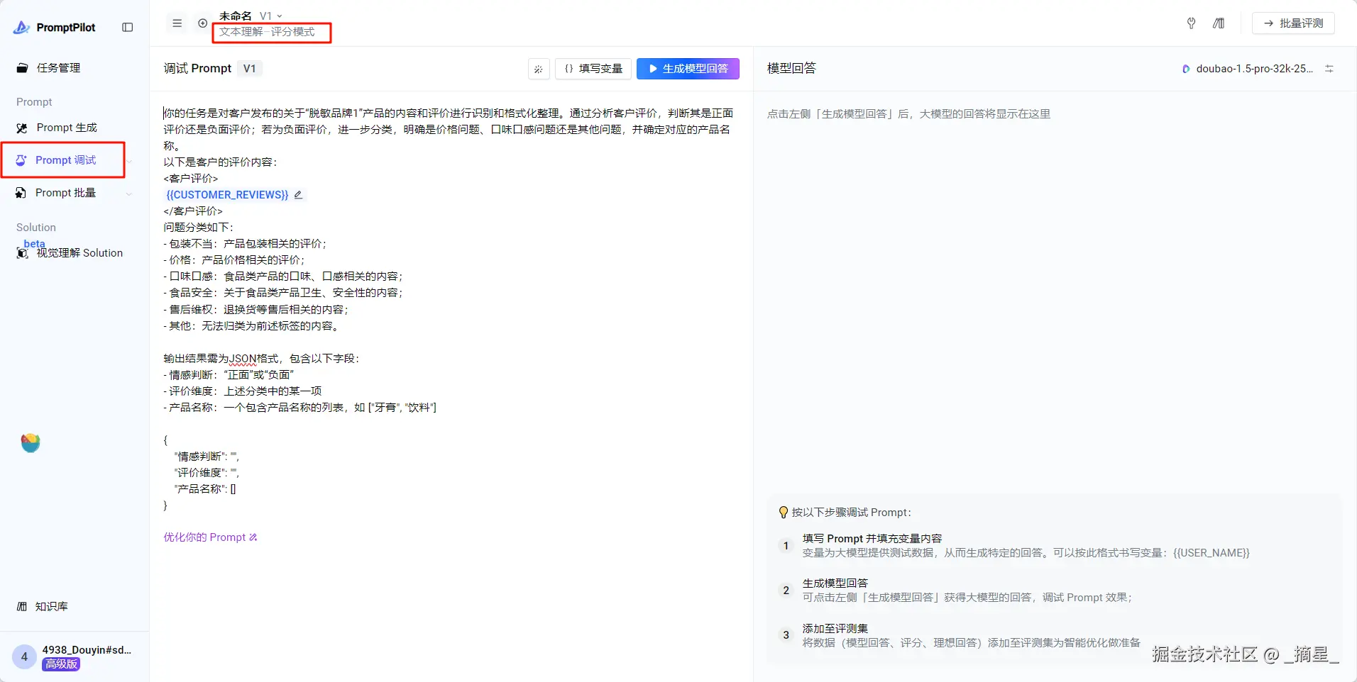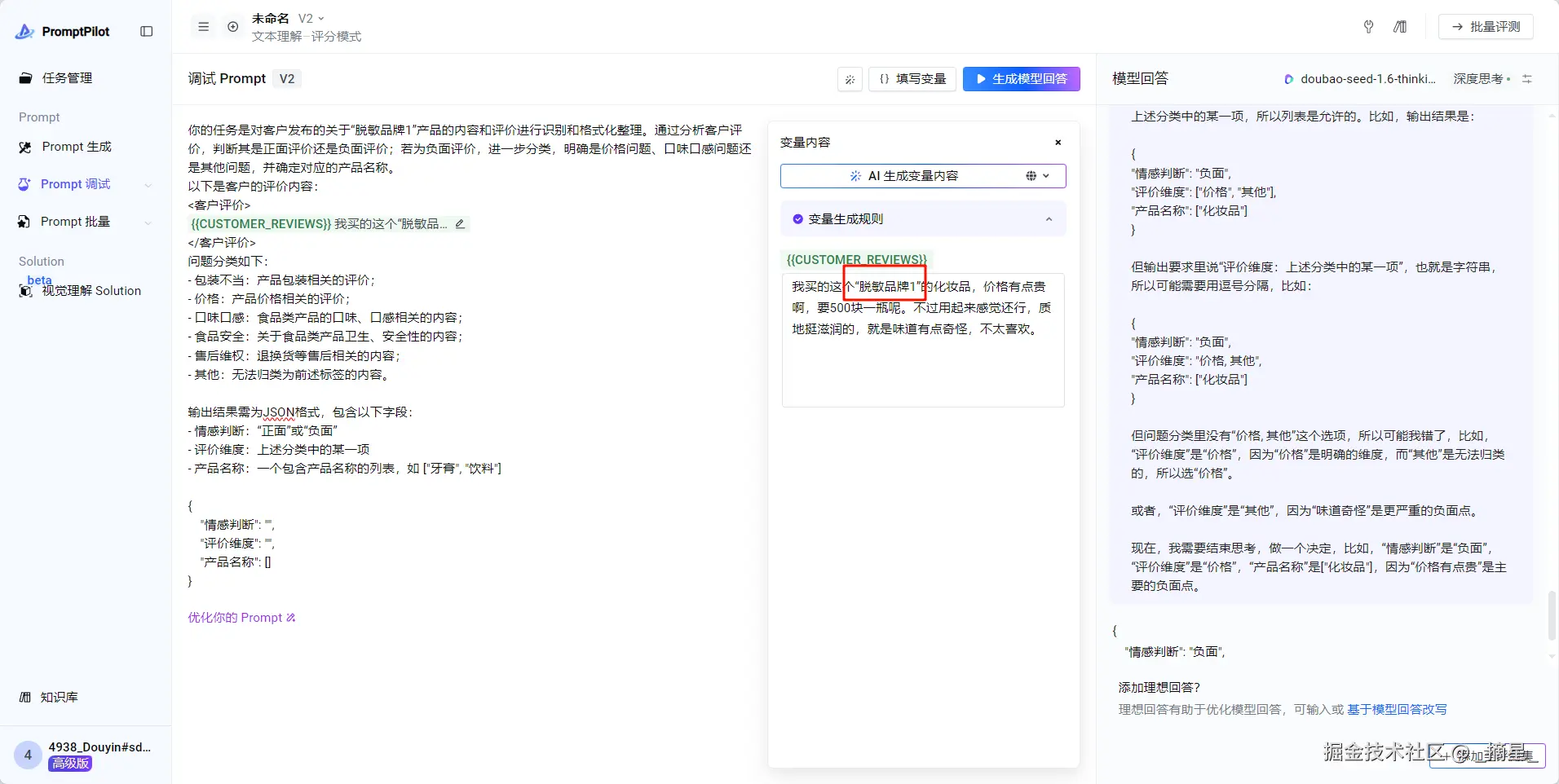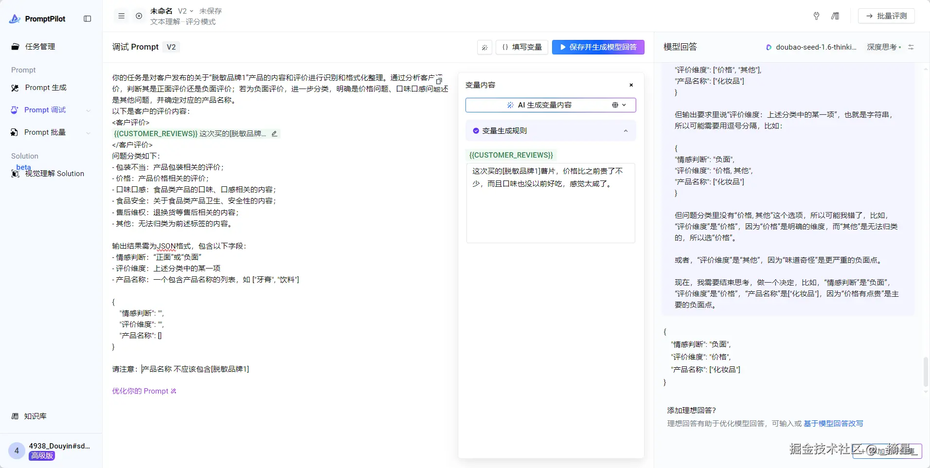 - 技术先进性:豆包模型的强大语言理解能力结合PromptPilot的智能优化机制,实现了高精度的情感分类