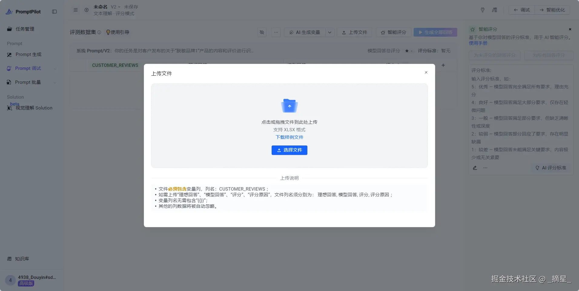 接下来,进行批量测试和智能优化。我们需要上传case集、配置评估标准、进行智能优化- 上传case集文件:首先,需要适配格式(修改两个列名),把原case文件当中的query列,重命名为:CUSTOMER_REVIEWS(因为prompt中的变量名称叫CUSTOMER_CONTENT,即{{}}中的名字);把原case文件中的reference_response重命名为:理想回答; 修改之后,上传case集合。修改之后的批量文件我放到了附件,感兴趣的朋友可以下载之后去看一下。