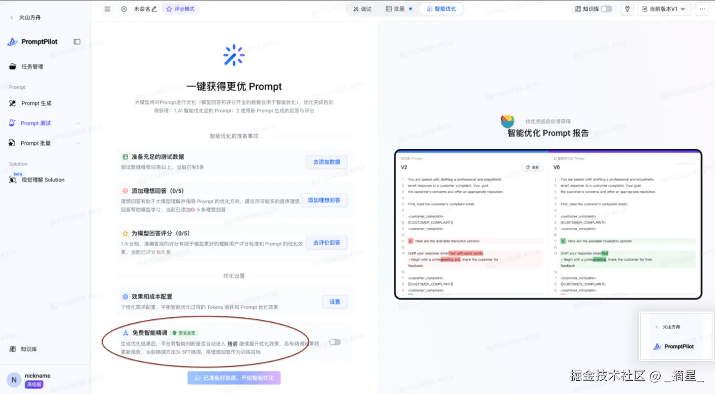 - 如果经过多次优化之后始终达不到满意的程度,promptPilot提供联动精调的能力,这个能力目前是在方舟平台,仅通过方舟平台登录可体验(免费智能精调)