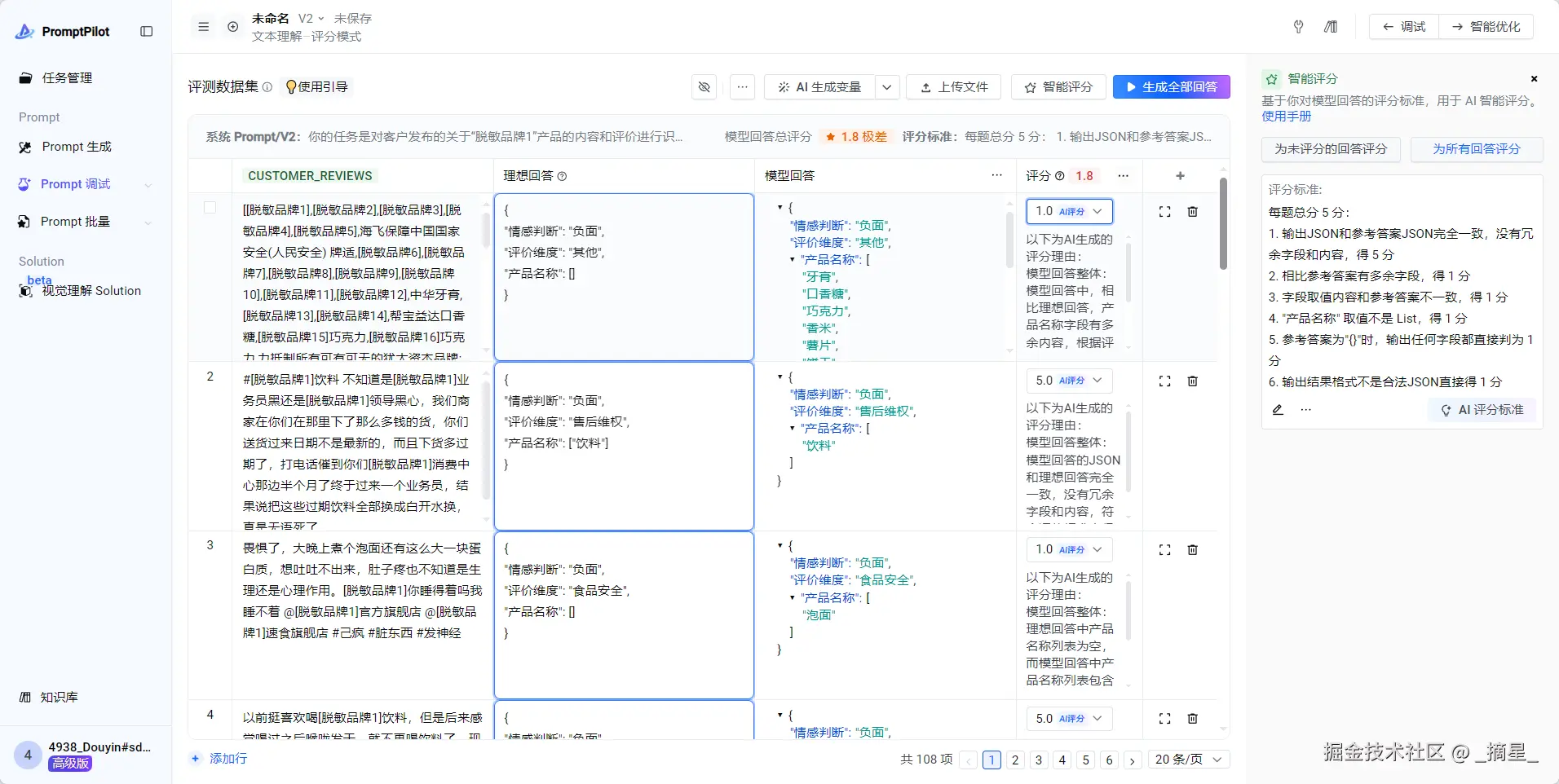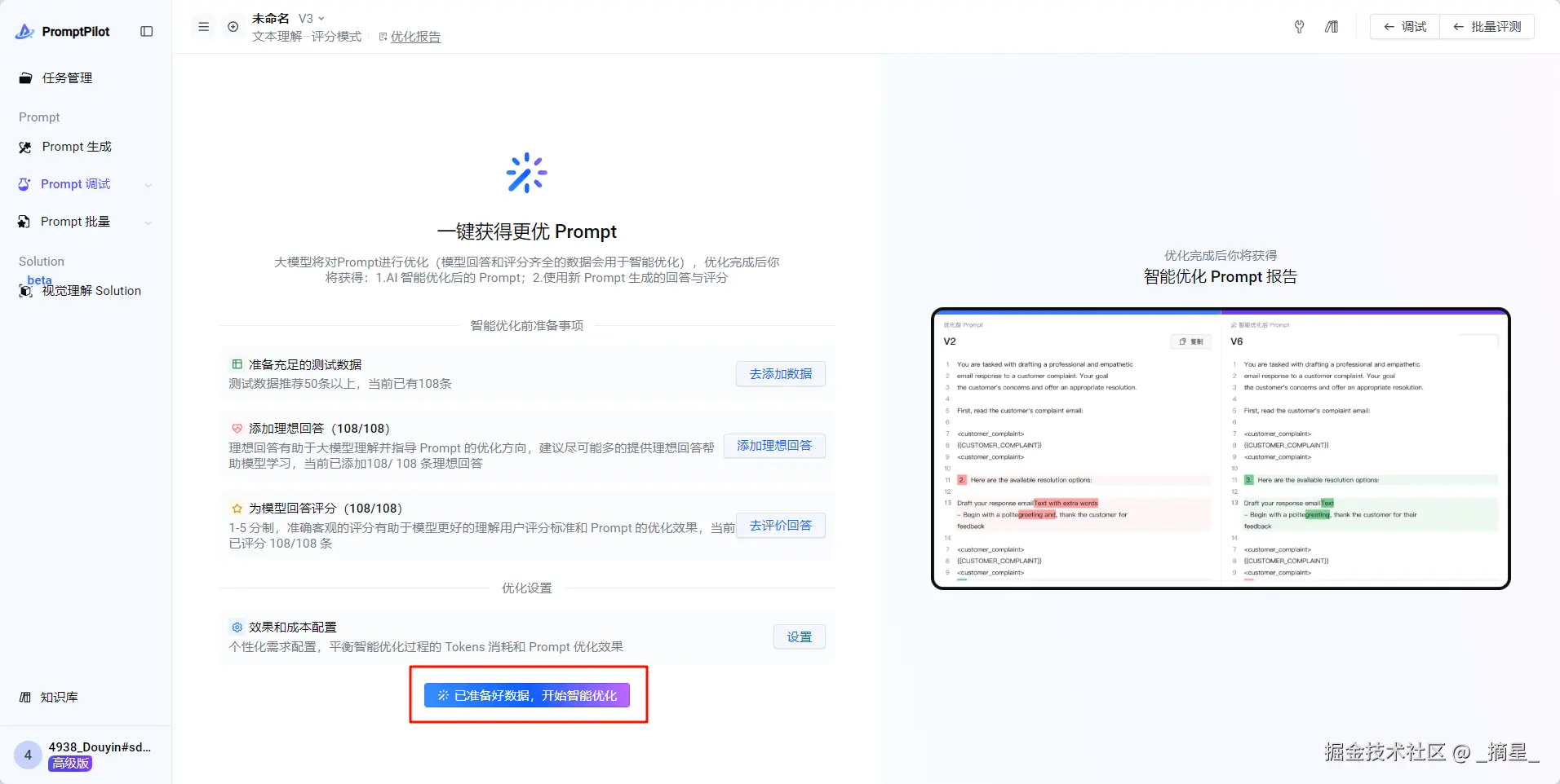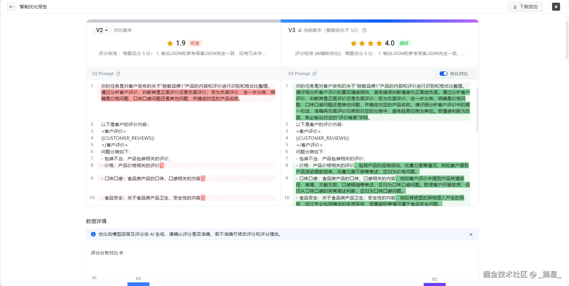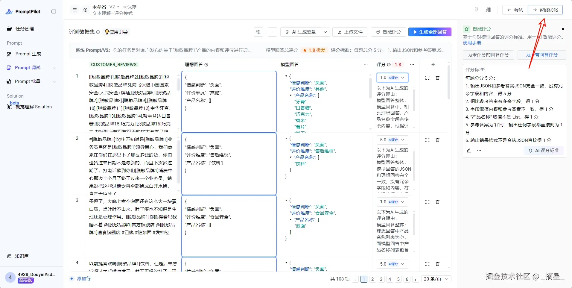 - 如果说,综合分数还没有达到预期效果,可以回到“智能优化”界面,在最新的Prompt基础上继续上面的优化流程,直到满足要求