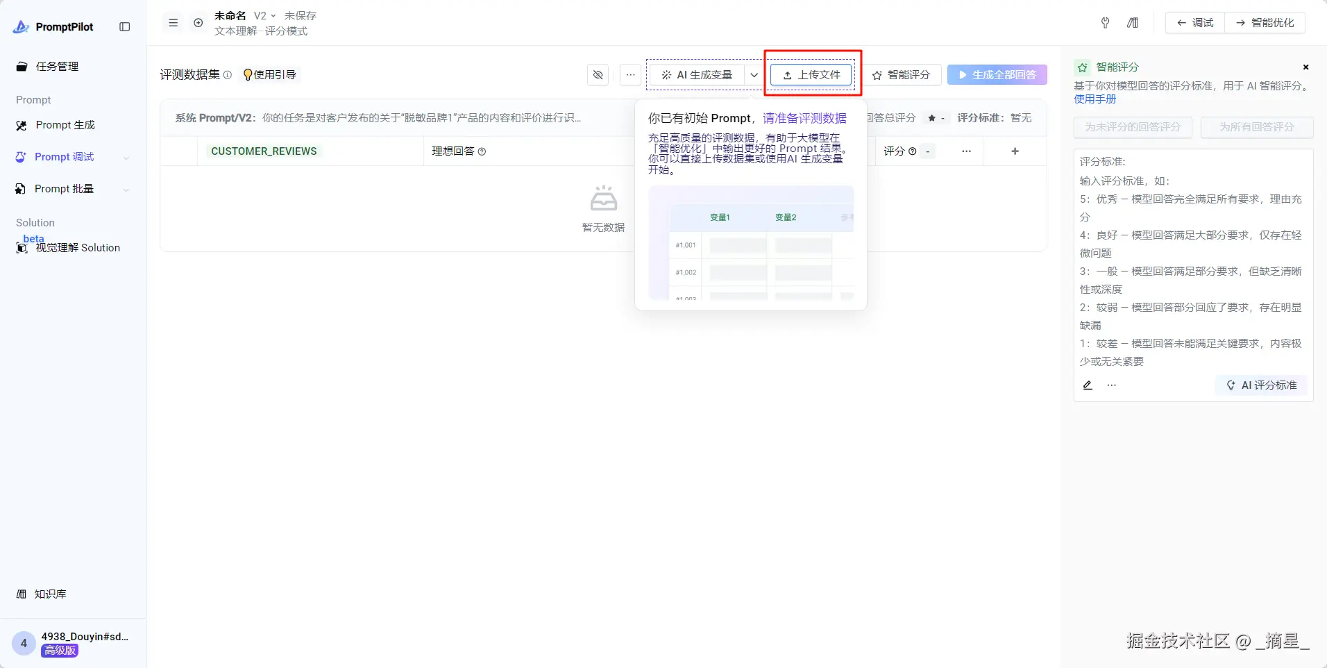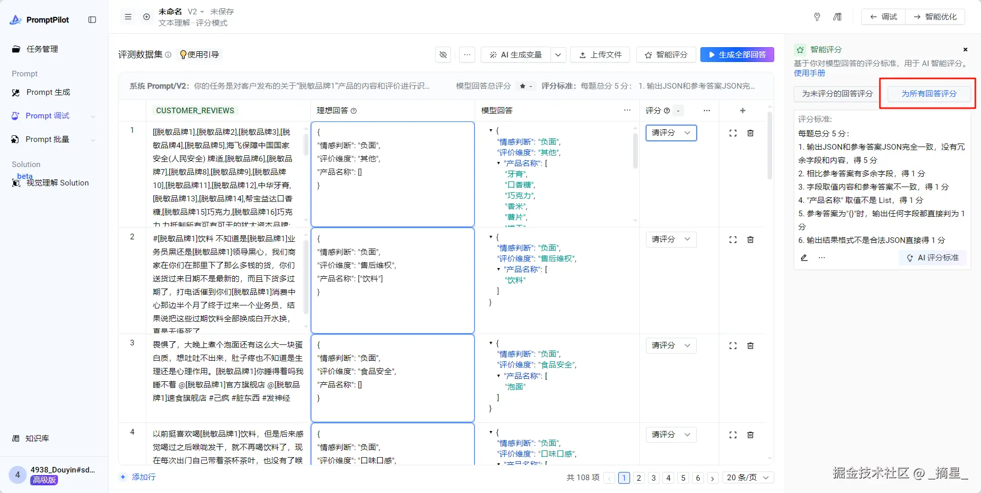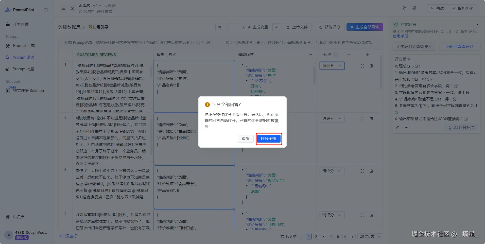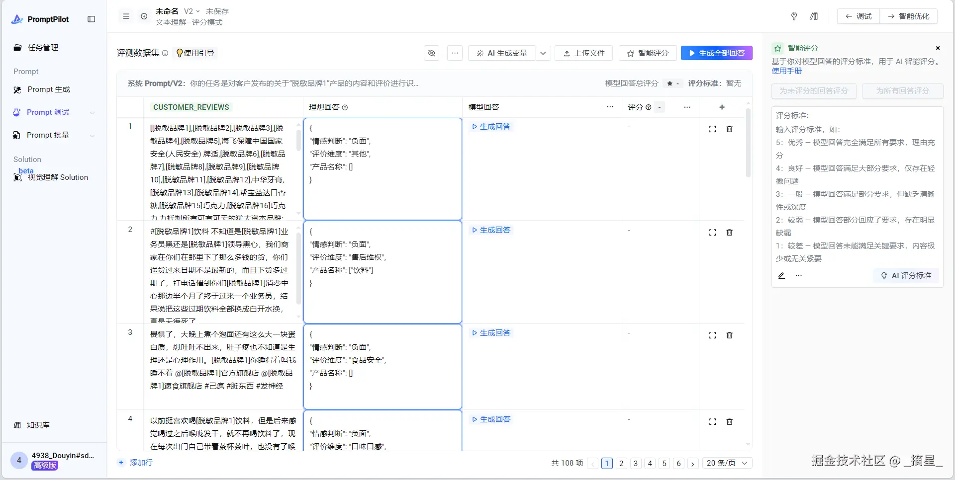 - 如果说,综合分数还没有达到预期效果,可以回到“智能优化”界面,在最新的Prompt基础上继续上面的优化流程,直到满足要求