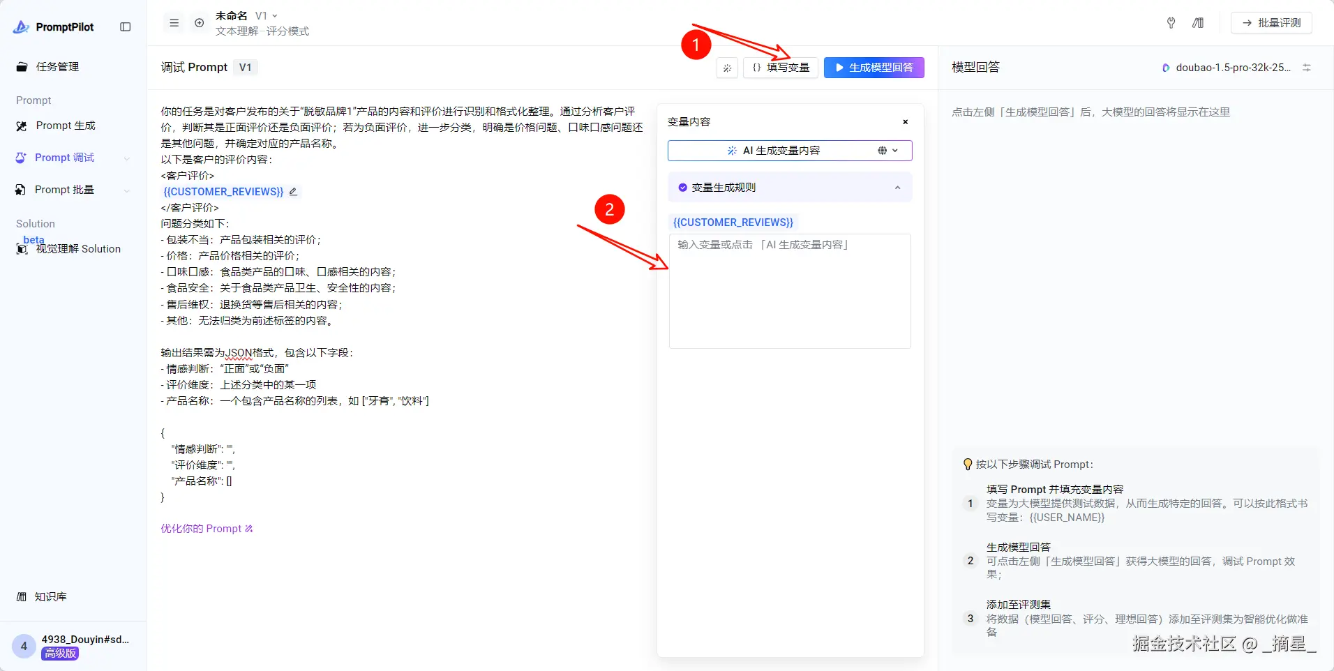 1. 单case调试:接上一步,点击“验证Prompt”,进入Prompt调试页,选择对应的模式- 填写变量:就是客户给的输入case,可以从客户给的case集当中,随机取一条case,输入“变量内容对话框”,进行调试和生成回答。