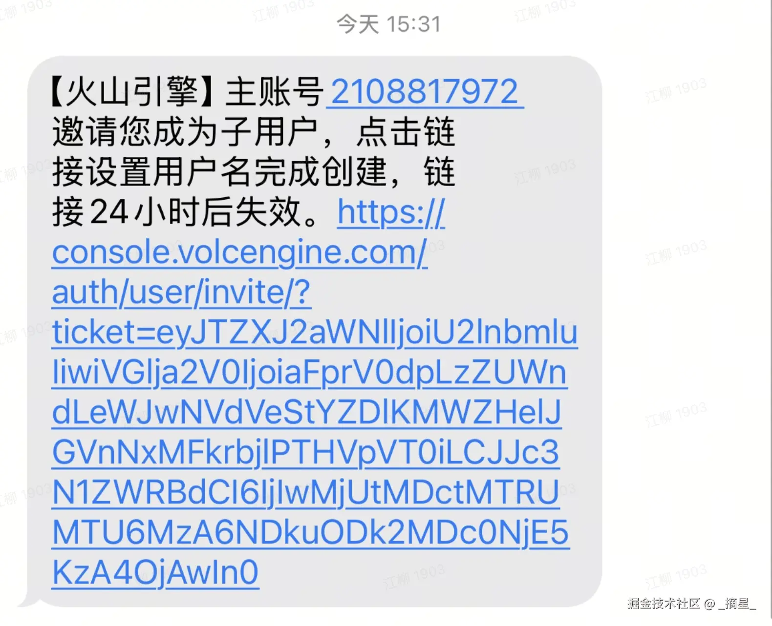 1. **账号准备:**请确保您已注册火山方舟账号:[注册火山方舟账号](https://console.volcengine.com/ark/region:ark+cn-beijing/);并实名认证:[火山方舟账号实名认证](https://console.volcengine.com/user/authentication/detail/)- **子账号准备:**您将收到以下短信,点击链接,输入您的专属昵称