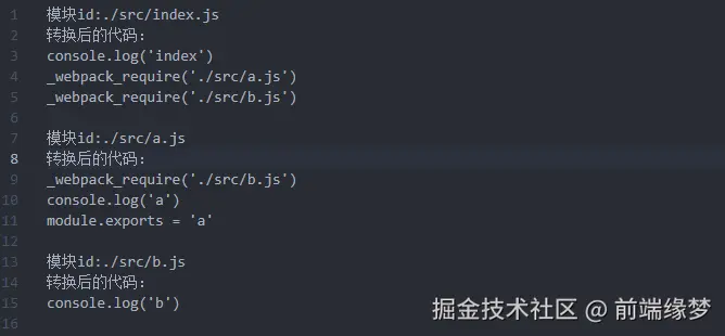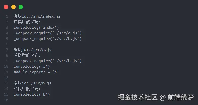 - 模块列表结构:包含模块 ID 和 转换后代码的对应关系,如 /src/index.js 对应转换后的 console.log 代码