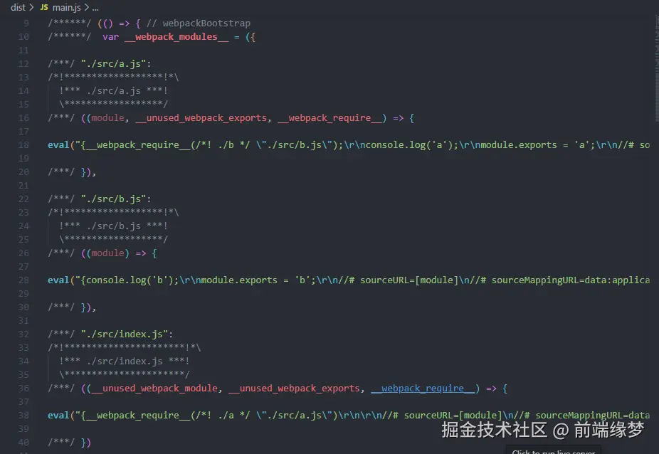 - 资源列表本质:是最终生成文件的文件名和内容映射表,如 /dist/main.js 对应打包后的函数代码