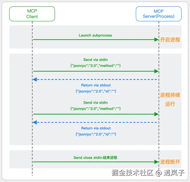 - MCP Client控制子进程(MCP Server)的启动和关闭。通信结束后,MCP Client关闭stdin,终止MCP Server