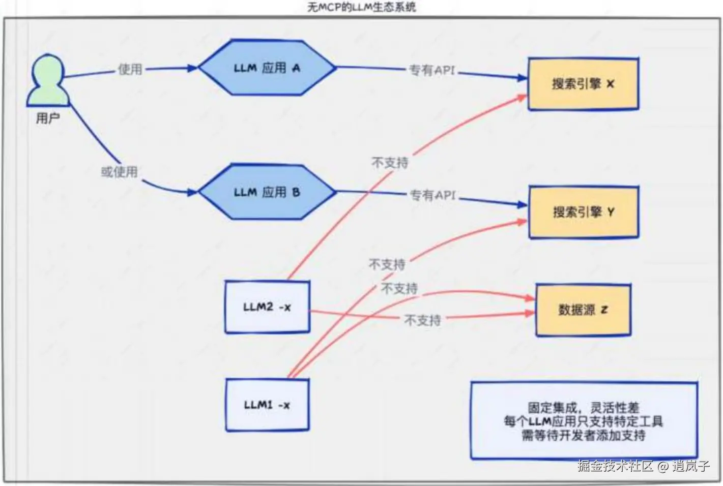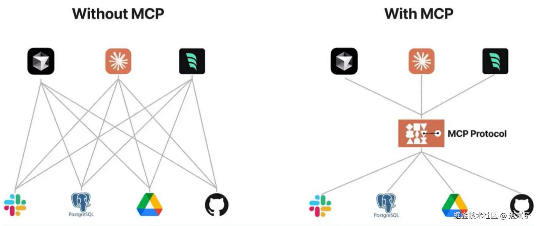 传统AI集成的问题:这种为每个数据源构建独立连接的方式,可以被视为一个M*N问题。