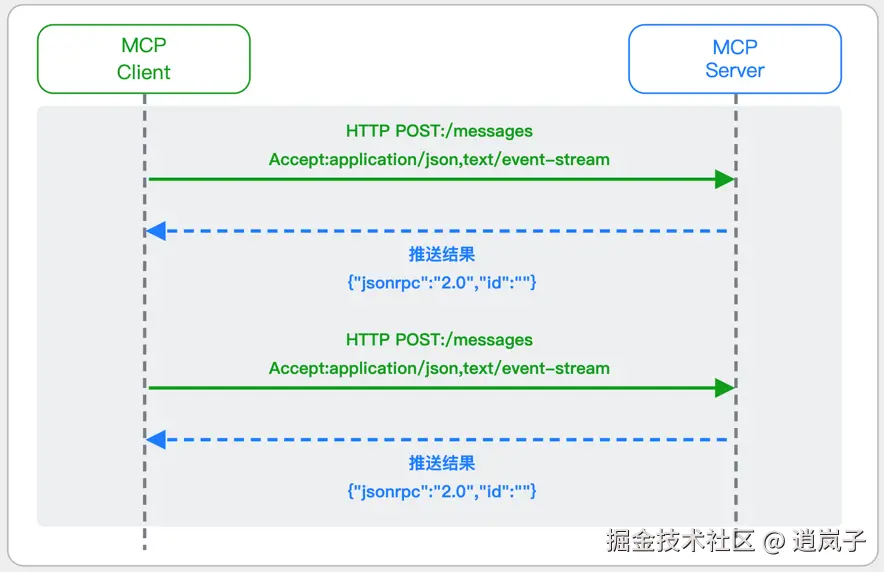 - 结果推送: 处理完成后,Server通过 SSE 通道推送 JSON-RPC2.0 响应,其中带有对应的Request ID