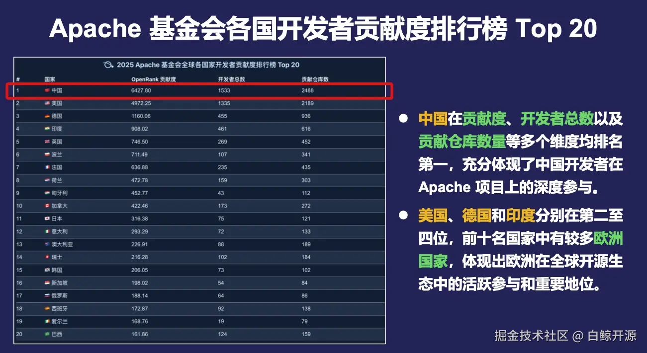 但中国开发者对于 Apache 基金会项目的参与不仅论“数量”,更是讲究“质量”。Apache 基金会各国开发者贡献度排行榜 Top 20 显示,中国在贡献度、开发者总数以及贡献仓库数量等多个维度均排名第一,充分体现了中国开发者在 Apache 项目上的深度参与。