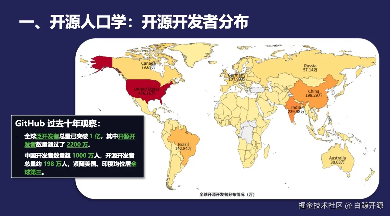 在最近落下帷幕的 Community Over Code Asia 2025,华东师范大学教授王伟老师基于《中国开源年度报告》进行的一场分享,用一组数字为这段历程做了注脚:全球开源开发者突破 2200 万,其中中国开发者 198 万,仅次于美国、印度。
