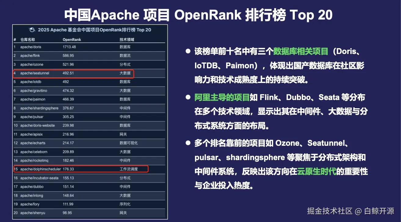 让我们欣喜的是,在榜单上,我们发现了SeaTunnel和DolphinScheduler的身影多次出现。